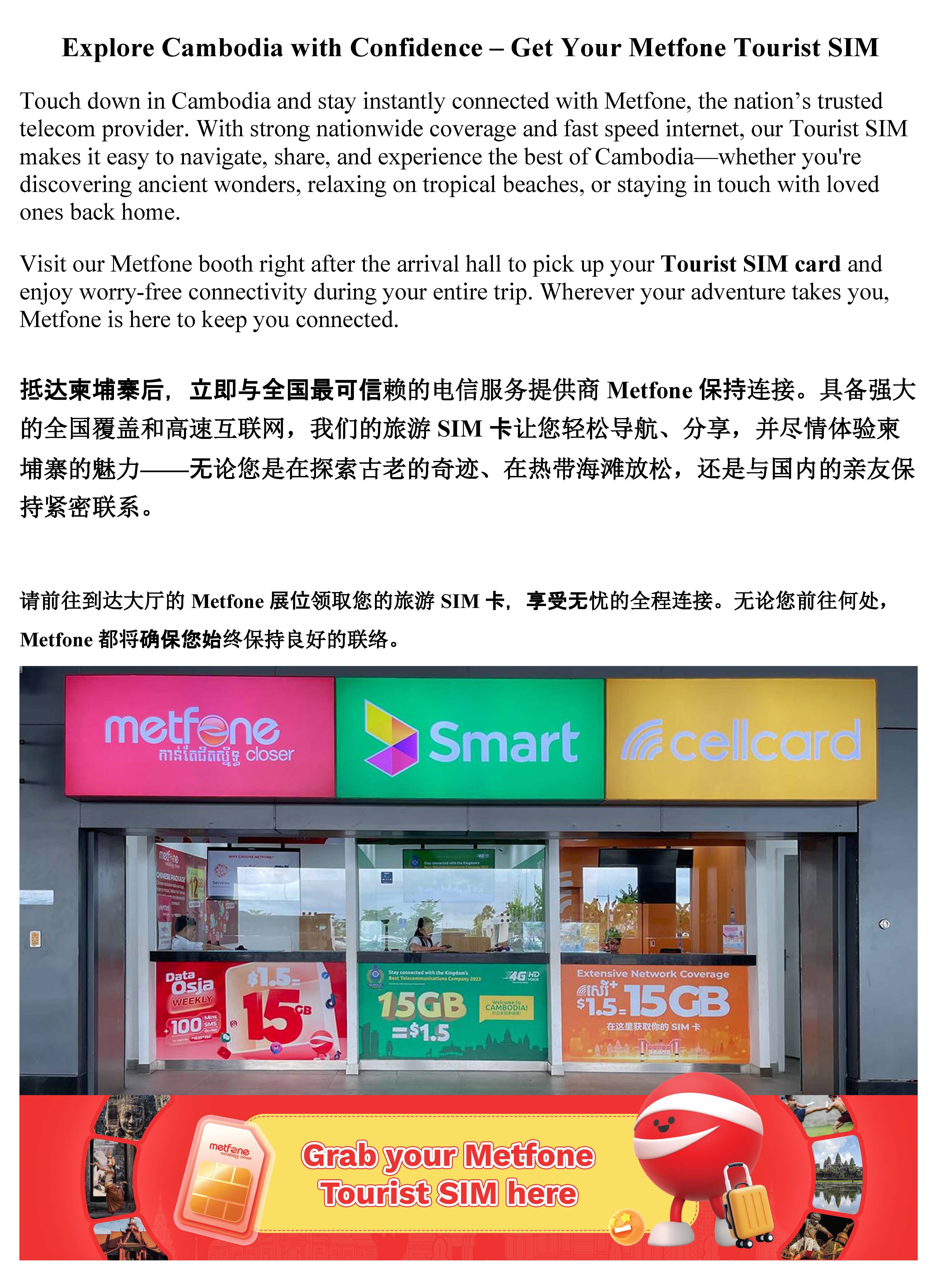入境后,您可以到Cellcard的展位获取免费SIM卡,并在旅游期间解锁无障碍连接。